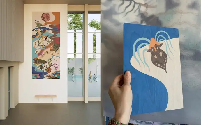 Konstgestaltningen ”Vattnets vilda varelser” kommer att utformas med intarsiateknik – en traditionell metod där formsågade bitar av träfanér sammanfogas till ett större motiv.